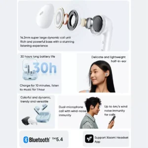 هندزفری ردمی بادز 6 اکتیو دارای درایورهای داینامیک با قطر 14.2 میلی متر بوده که باعث شده بیس و صدای اکوستیک قوی تری به شما ارائه دهد و تجربه شنیداری لذت بخشی به ارمغان بیاورد. قابل ذکر است هندزفری بلوتوث Redmi Buds 6 active دارای 5 حالت صدای داخلی برای پاسخگویی به تنظیمات مختلف است. این حالت ها شامل Bass Boost, High Treble Boost, Vocal Boost, Volume Boost و default mode است.