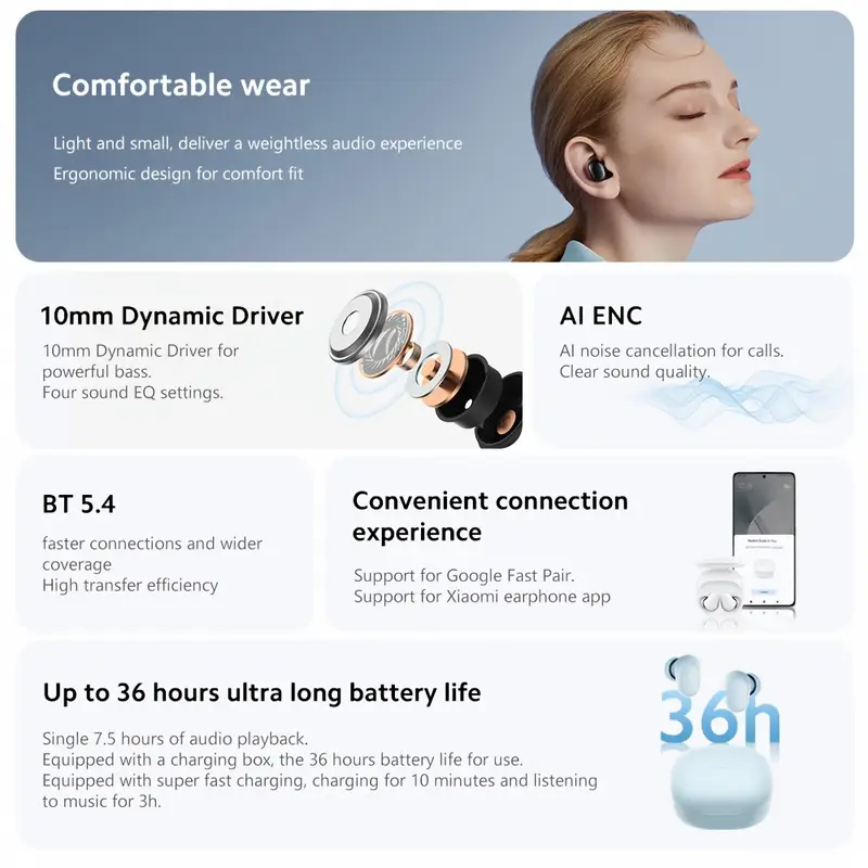 در هندزفری Redmi Buds 6 Play از میکروفون هایی استفاده شده است که به صورت هوشمند برای حذف نویز عمل می کنند و با توجه به مکانی که در آن قرار دارید نویز را حذف کرده و صدای کاملا شفاف و با کیفیتی را منتقل می کنند.